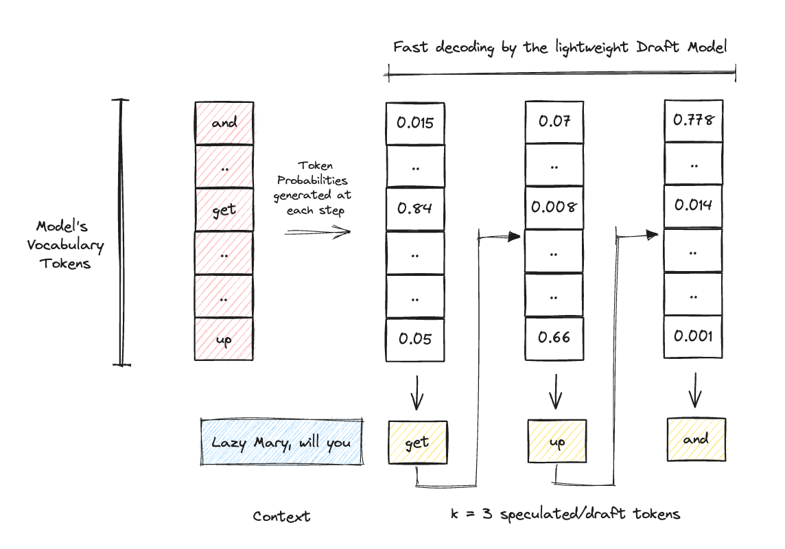 Once we are done with choosing the draft model, the next step is to run a forward pass on the model and generate a specific number of draft tokens (K = 3 in the example below).
