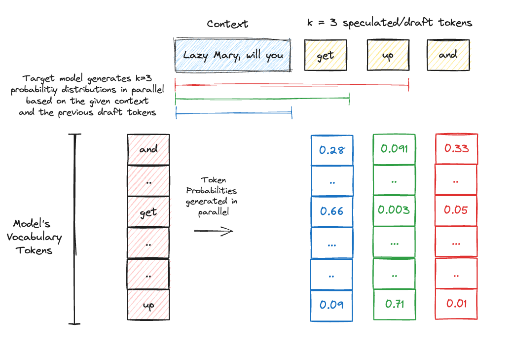 Once the target model generates the probability across the model’s vocabulary for all these K positions, the probability of the draft token as generated by the draft model is compared to the probability for the same token as per the target model’s generated probability distribution. Yes read it once more and don’t worry, we have the algorithm covered in detail below.