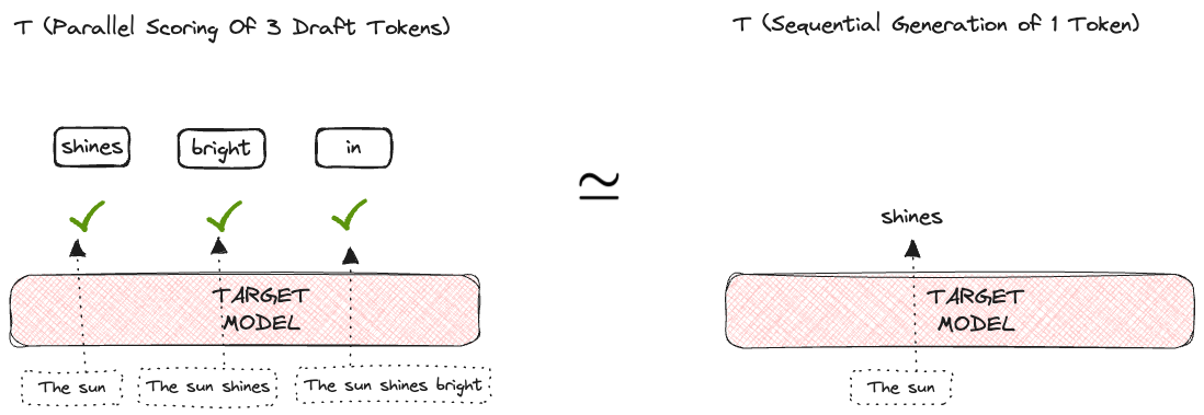 The success of this algorithm is based on the observation that the latency of parallel scoring of short drafts is comparable to that of sampling a single token from the larger target model.