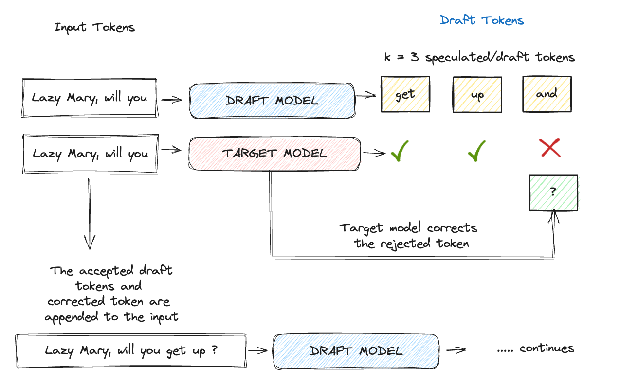 If a draft token, say at position i, is rejected (implies all the tokens following it are also rejected), the accepted draft tokens + the target model’s prediction for the ith position is appended to the original input.